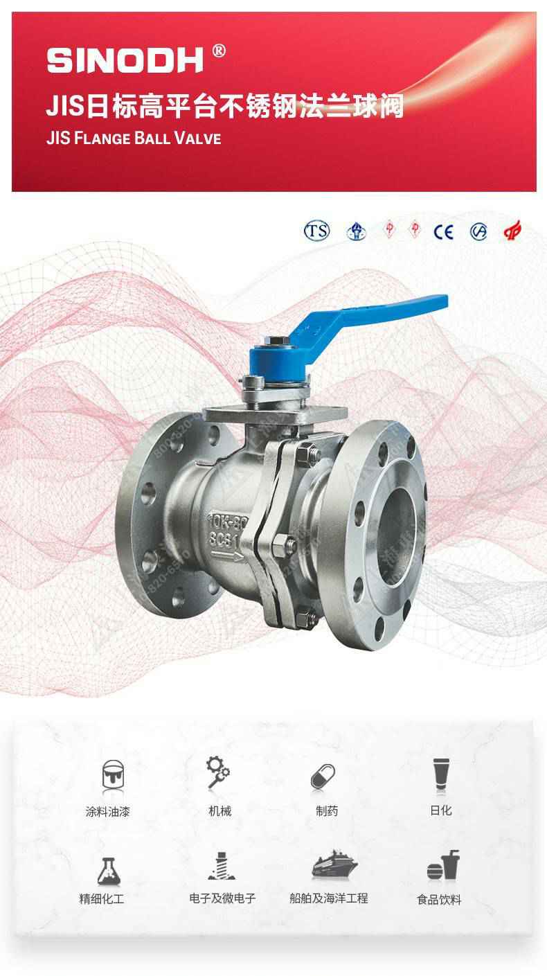 JIS日标高平台不锈钢法兰球阀,为宝盈官网_宝盈(中国)一站式服务官网自主研发生产本产品设计制造标准符合J1 SB2071标准,该产品的球体(密封件)是浮动的,在介质压力作用下,球体能产生-定的位移并紧压在出口端的密封面上,保证出口端密封。适用于水、溶剂、酸和天然气等一般工业介质,也适用于工况恶劣的介质,如氧气、过氧化氢、乙烯等介质。